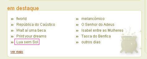 . Pois é, sou novamente "destaque" dos Blog's do Sapo. Este Blog para mim, e como sempre referi, é um entretém e uma maneira de deitar cá para fora algumas coisas. Não é nada de especial, mas penso que muita gente se revê um bocadinho no que aqui deixo assim como eu me revejo em muitas coisas que leio neste Mundo dos Blog's.